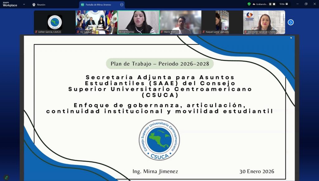 En modalidad virtual el Consejo Superior Universitario Centroamericano (CSUCA) celebró la CXXVI Sesión (de carácter extraordinaria) con el propósito de elegir a la profesional representante de la Secretaría Adjunta para Asuntos Estudiantiles, para el período 2026-2028, dicha sesión contó con la participación de las universidades miembros de la región centroamericana y el Caribe.